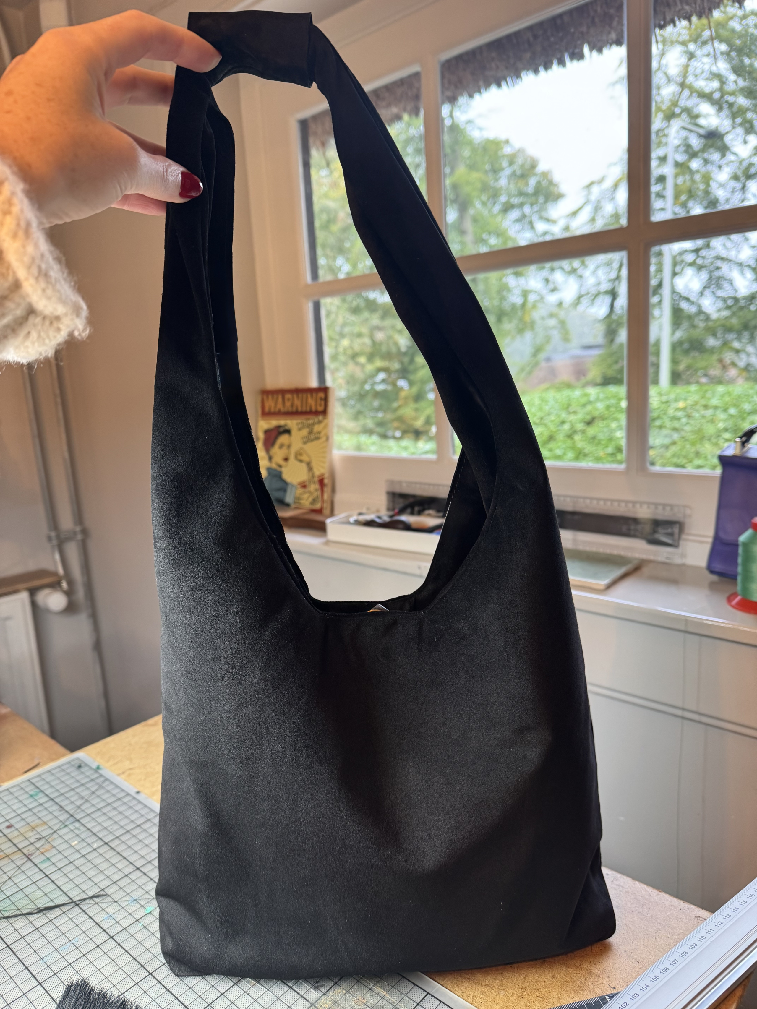 Het proces van ontwerpen, snijden en naaien met suède liet me zien hoe bijzonder dit materiaal is. Het reageert onder de naaimachine met zachtheid en beweeglijkheid, en vraagt om een lichte, rustige aanpak. Naden en stiksels laten sneller sporen achter als je niet precies en bedachtzaam te werk gaat. Het materiaal nodigt uit tot vertragen, voelen en luisteren het komt op de juiste momenten tot rust, en dat brengt rust in het hele maakproces.